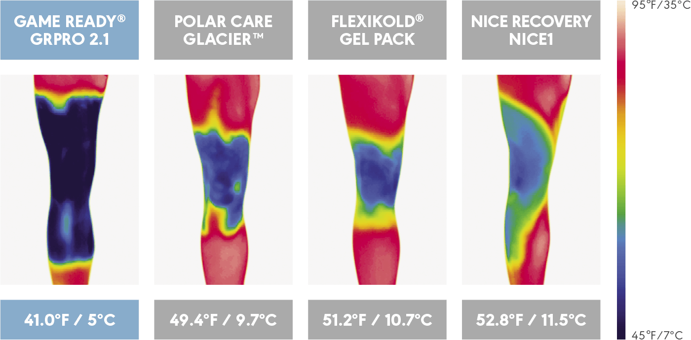 Game Ready wraps allow for the coldest skin surface temperature for up to 30 minutes post-treatment compared to other devices tested.